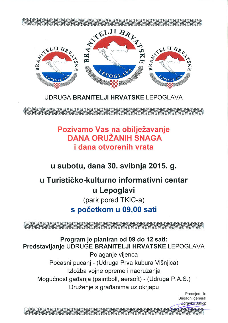 Dan oružanih snaga bit će obilježen u Lepoglavi. Udruga Branitelji Hrvatske Lepoglave organizirat će 30. svibnja, povodom Dana oružanih snaga, prigodan trosatni program u parku pored Doma kulture (TKIC).